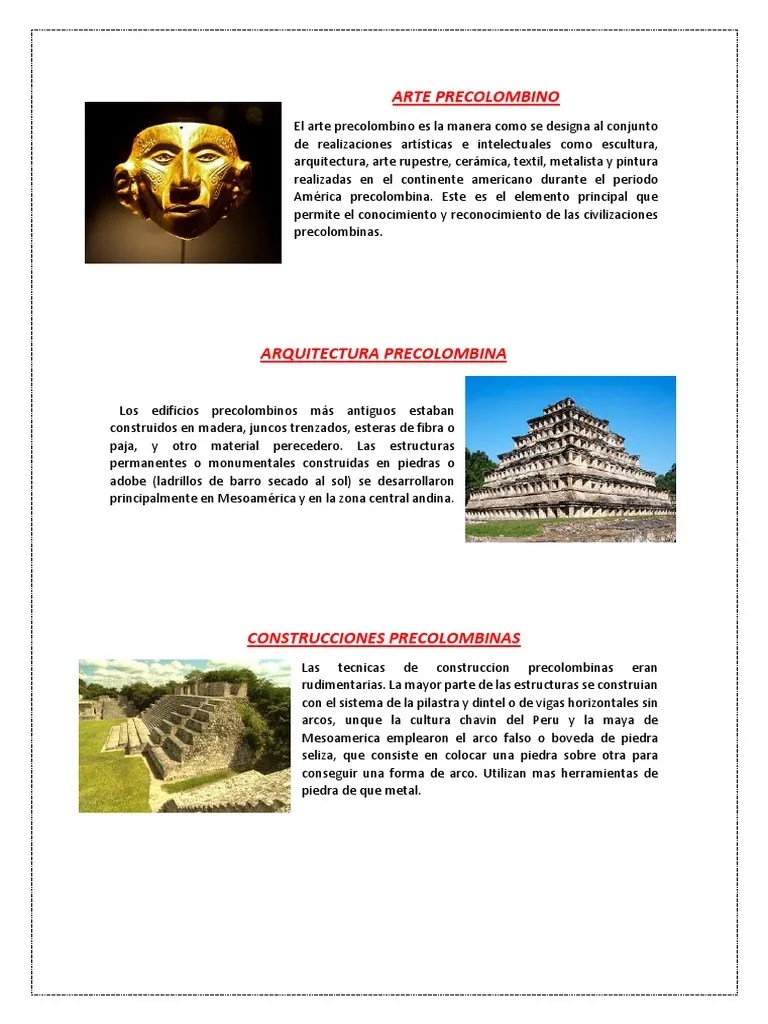 Solo se conservan restos de cerámicas y murales, donde se aprecia la belleza y el color de su obra... Este arte se manifestaba, en dibujos y pinturas en papel o al fresco, bajo y alto relieves en piedra, madera, barro, y hueso, así como figurillas de barro. Comprende todos aquellos objetos de arte creados por los diferentes pueblos originarios antes de la llegada de colón y la influencia hispana. De hecho, si el arte olmeca es definido por reilly (1999: A pesar de que no se preservan telas tejidas por los mayas, su calidad y ornamentación pueden apreciarse a través de las representaciones en pinturas, figurillas y esculturas. Solo se conservan restos de cerámicas y murales, donde se aprecia la belleza y el color de su obra.